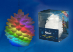 Иллюминац. украшение 80м светодиод. (LED) rgb UnielULD-F003 RGB PINE CONE Фигурка светодиодная на батарейках «Шишка». Цвет свечения — RGB. Размер — 8*10 см. IP20. Батарейка- CR2032(в/к). Упаковка — коробка.