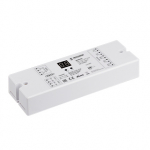 Мощный DALI диммер на 4 адреса, для одноцветных или RGBW светодиодных лент, 4 асинхронных канала. Управляется сигналом DALI или кнопками PUSH DIM. Питание/выход 12-36 VDC. Высокая частота ШИМ 1500Гц. Макс.ток 4x8A. Размеры 168x58x28 мм.