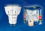 Uniel Лампа LED Merli GU10 6W 3000KLED-JCDR-6W/WW/GU10/FR/38D ALM01WH Лампа светодиодная. Материал корпуса алюминий. Цвет свечения теплый белый. Серия Merli. Упаковка пластик