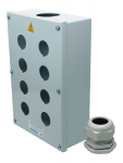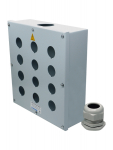 Корпус ПКУ 15-21 представляет собой металлический короб с порошковым покрытием, состоящий из основания с отверстием под сальник типа PG, и крышки с отверстиями для установки выключателей типа ВК, КЕ, переключателей типа ПЕ и светосигнальной арматуры типа СКЛ. Размер посадочного места под аппарат - Ø 30 мм.
