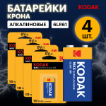 Батарейка 9В 27мм четырехгранник 6lr61 щелочная марганцевая (алкалиновая) KodakБатарейки Kodak 6LR61-1BL MAX SUPER Alkaline [K9V-1] набор 4шт