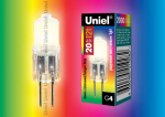 Лампа галогенная капсульная G4 20Вт 12В UnielJC-12/20/G4 RB Лампа галогенная с прозрачной колбой и радужным свечением. Картонная коробка