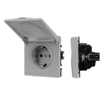 Механизм розетки с заземлением и влагозащитной крышкой на 1 пост. Цвет - никель, с Soft-Touch поверхностью. Без фронтальной рамки. Уровень пылевлагозащиты IP44. Розетка устанавливается в стандартный подрозетник круглого сечения диаметром 60мм.