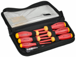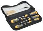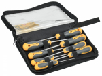 Набор диэлектрических отверток серии К3 рассчитан на использование под напряжением до 1000В. Набор включает в себя: крестообразные отвертки PZ1x80, PZ2х100; шлицевые - SL2,5х75, SL4,0х100, SL5,5х125, SL6,5х150 и отвертку-пробник ОП-1.